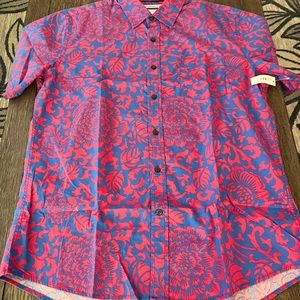 Blue and fuschia colored floral graphic print.