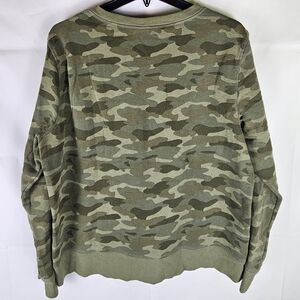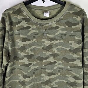 Gently used sweatshirt. Camouflage print. Long sleeves. Crewneck. Fleece interior. Ribbed neckline, sleeve cuffs and bottom hem.