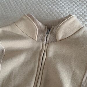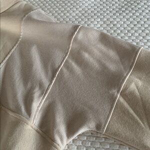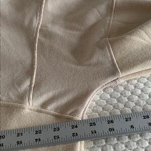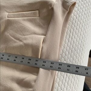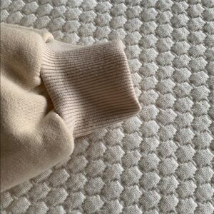pullover Sweatshirt.Ribber at waist , wrist and inside of collar. Two front side pockets. Lighter tan in color.. maybe darker cream ( not super dark). Very neutral. New without tags, never worn. Size: Medium. (12525)