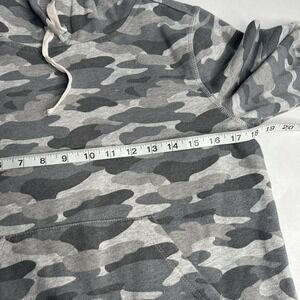 This is an Amazon Essentials Women's Hoodie in size XS. It is a gray pullover sweatshirt with a camouflage theme, suitable for activewear.