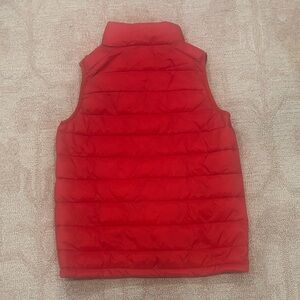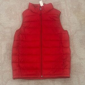 Bright red puffer vest. Sleeveless design. Full front zipper. Ideal for layering.