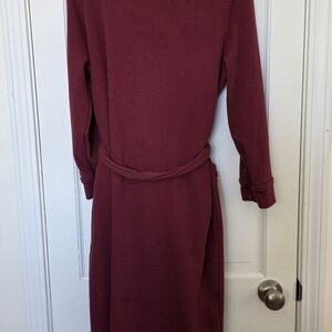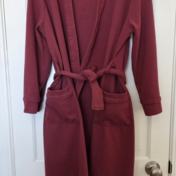 Comfortable maroon waffle knit robe with tie belt and pockets.