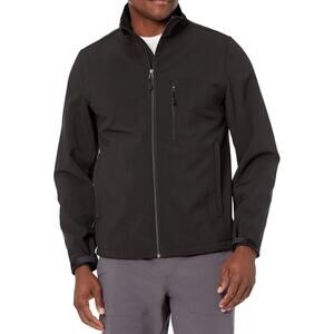 Men's Amazon Essentials Water-Resistant Softshell Jacket in black, size M. This jacket is perfect for transitional weather, offering a comfortable fit and protection from the elements. It features a full zip closure, a zippered chest pocket, and two zippered hand pockets for secure storage. The softshell material is water-resistant, making it ideal for light rain or misty conditions. Great for everyday wear or outdoor activities.