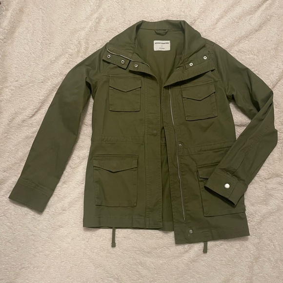 Casual olive green jacket. Features practical design. Ideal for everyday wear.