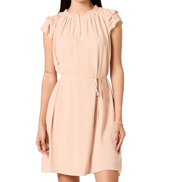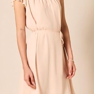 This charming dress in a soft blush hue features a relaxed design with a tie front for added elegance. The flutter cap sleeves and crew neckline enhance its romantic appeal, making it perfect for wedding guest or cocktail occasions. Its mini length and airy fabric ensure a comfortable and stylish fit.