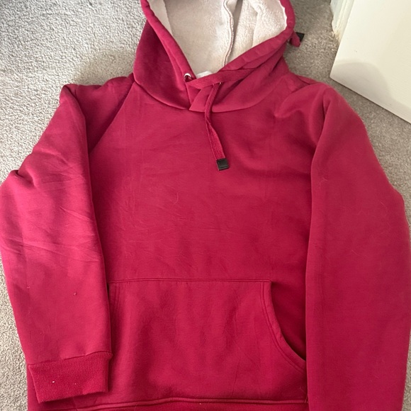 Cozy red hoodie. Soft fabric. Front pocket. Adjustable hood.