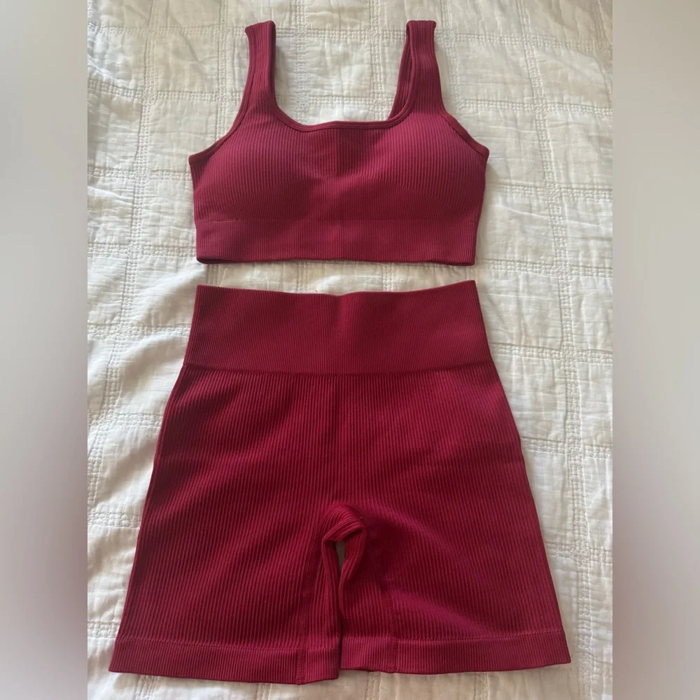 Stylish ribbed two-piece set. Includes crop top and high-waisted shorts. Comfortable and versatile.