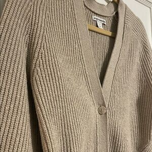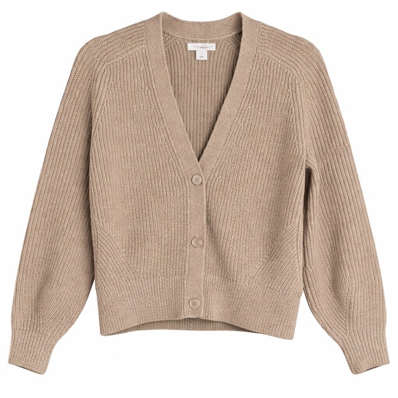 Soft ribbed knit cardigan with a V-neck and button-front closure. Lightweight, cozy feel for layering. Simple silhouette for everyday wear.