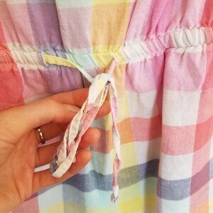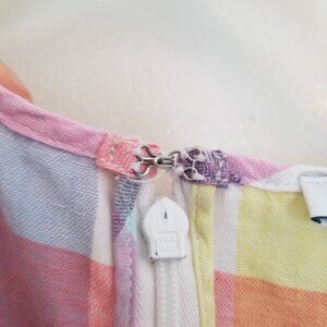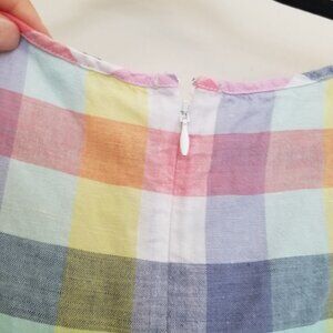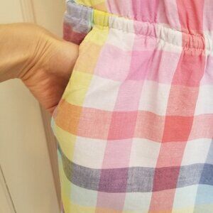 This Amazon Essentials "onesie" is such a fun garment, with a bright checkered pattern and soft linen fabric. Includes a hidden back zipper and hook closure, functional pockets, and an adjustable tie waistline. Size 4, and measures 17 1/2" pit-to-pit. Very low maintenance, comfortable, and gets lots of compliments! This is a linen garment, although the fabric content isn't pictured and a tag isn't available. Machine wash and line dry is recommended for linen.