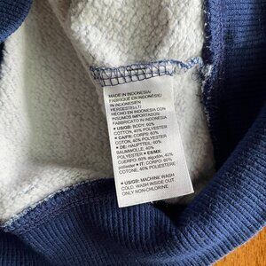 Amazon Essentials blue sharks sweatshirt in kids' size XS 5-6. Navy blue with lighter blue shark print all over except for the ribbed collar, cuffs and hem. Nice shark pattern, not too intense or too cutesy. GUC; noticeable all-over fading and pilling from the wash (see close photos), but super comfortable and otherwise in good condition.