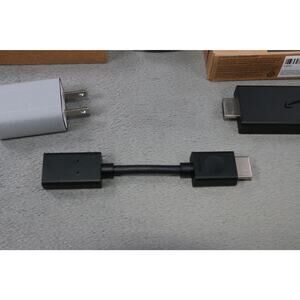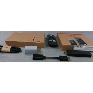 Light wear, minor signs of use on the device and remote; retail box shows light handling. No major cosmetic flaws observed. Includes Fire TV Stick, Alexa Voice Remote, HDMI extender, USB power cable, and power adapter as shown. AAA batteries are not included.