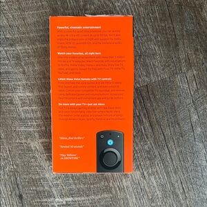 Amazon Fire TV Stick 4K with remote. Black stick and remote. Orange packaging with streaming service logos.
