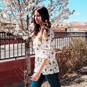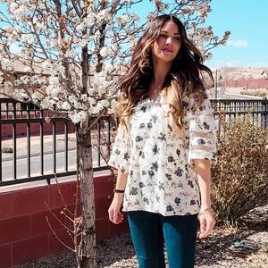 New floral top. Only worn for pictures. Cream and blue with pretty detailed bell sleeves and deep v neck.