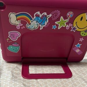 Brighten up your tablet with this Amazon pink cover, adorned with fun stickers and a practical built-in stand. The lively design not only adds a splash of color but also ensures your device is well-protected and easy to use.