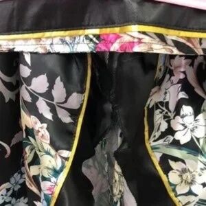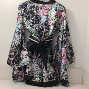 Beautiful Black silky Kimono Robe from Amazon. Can be worn around the house or as a costume piece. Multiple tie closures, comes with matching waist wrap. Sleeves are traditional Kimono style with extra material toward the bottom for that touch of feminine elegance. Elaborate multi color design. NWOT