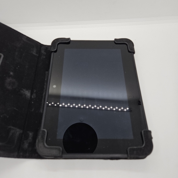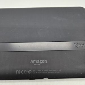 Kindle Fire HD 7" in a gray faux leather Belkin case that opens like a book, or can be used to stand your Kindle up on its side. Has been factory reset. Charges up and holds a charge. In good condition. Does not come with a charging cable.