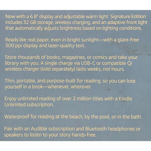 Amazon Kindle Paperwhite 11th Generation, sleek and powerful, eBook reader with 6.8-inch display, 300 DPI resolution, 32GB of storage capacity, Wi-Fi connectivity, Bluetooth, USB-C ports for charging and connectivity, waterproof, wireless charging capabilities. nor scuff marks on the back of the packaging. A minor crease on the left middle of the packing. Either of these minor observations affect the integrity of the item inside. Minor scuff marks on back of package but unopened, new in box. Please see pictures for further clarification on condition.