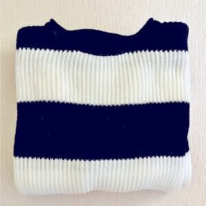 Stylish crew neck sweater. Bold black and white stripes. Perfect for casual wear.