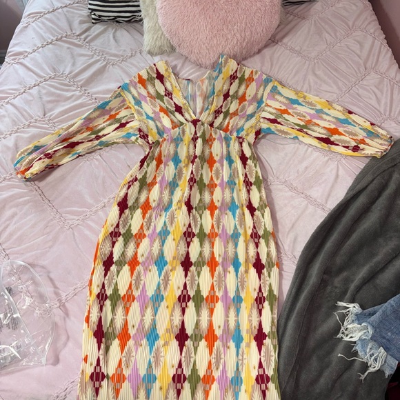 Vibrant dress with geometric pattern. Long sleeves. Perfect for any occasion.