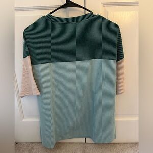 Ribbed knit tee with green, blue, and cream sections. Ideal for casual wear.