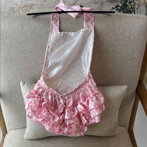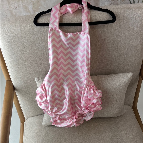 Charming pink chevron romper with playful ruffles. Ideal for sunny adventures.
