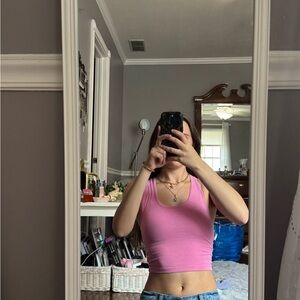 Chic pink crop top. Sleeveless design. Perfect for casual wear.