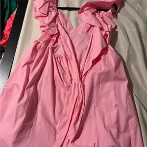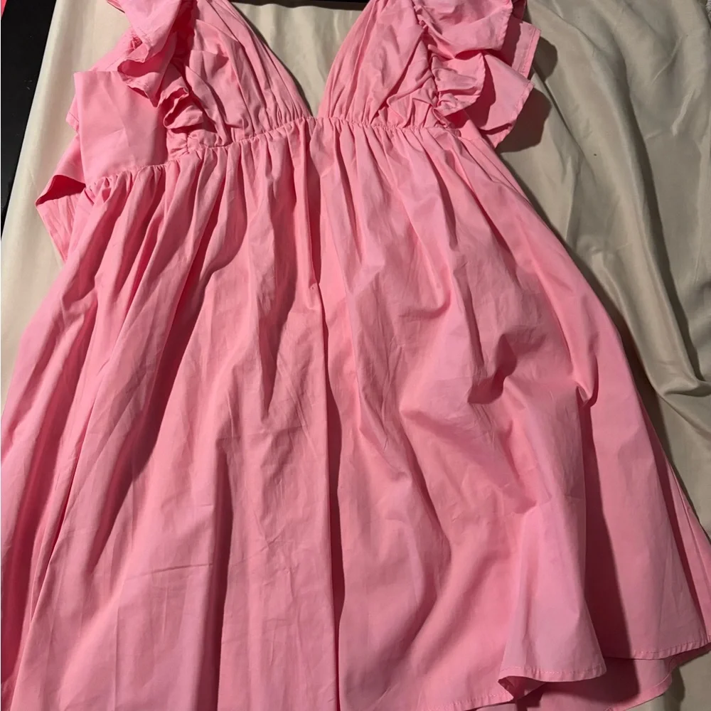 Charming pink dress with ruffle sleeves. Perfect for casual outings.
