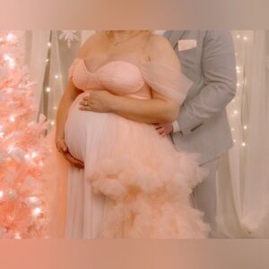 This beautiful blush maternity dress has been worn one time for my baby shower. It made me feel absolutely stunning. I wore an additional skirt with it just because I didn’t want my belly out but it does have the option to wear it that way. The tulle is very flowy and full. It truly is a stunning dress and made me feel like a princess.