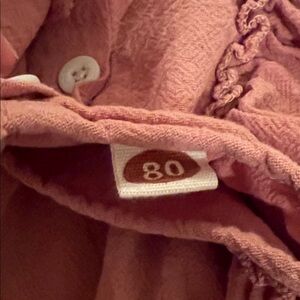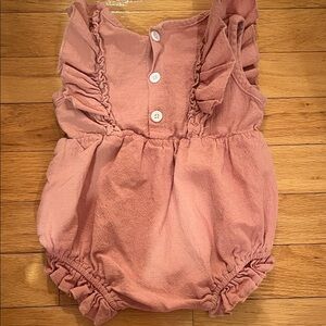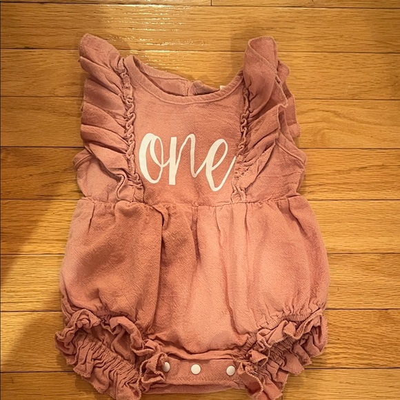 Adorable pink one piece with ruffles. Features 'one' print. Perfect for special occasions.