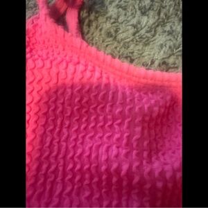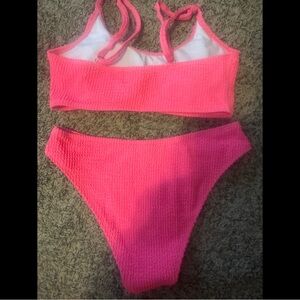 NEVER WORN. Bright pink textured bikini set. Features a scoop neck top and high-waisted bottoms.