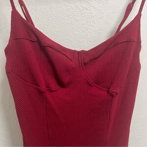 Stylish red ribbed bodysuit with spaghetti straps. Perfect for layering or wearing alone.