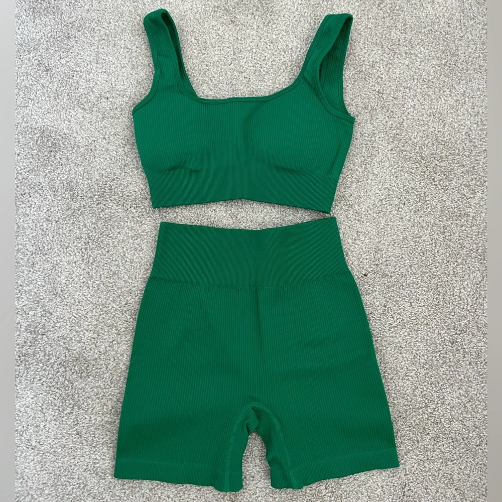 Green ribbed two-piece set. Includes a bra top and high-waisted shorts. Worn once.