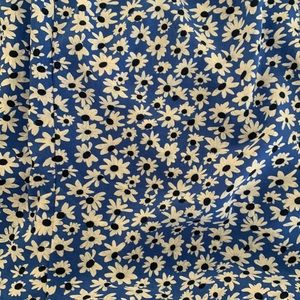 Blue floral romper with off the shoulder sleeves and ruffle hem