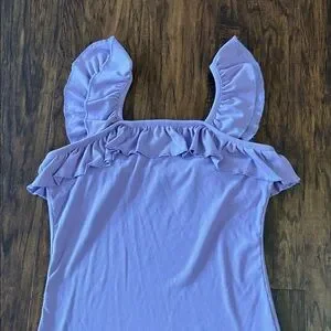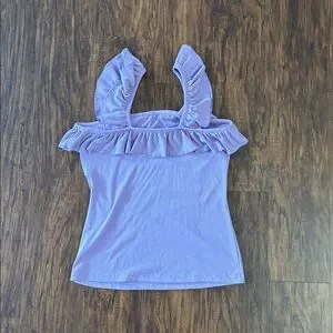 Soft lilac tank top with feminine ruffle straps and flounced square neckline. Lightweight, breathable fabric for everyday wear. Easy to pair with jeans or skirts for a polished casual look. Couple spots with pilling. Worn once or twice. Comes from smoke and pet free home.