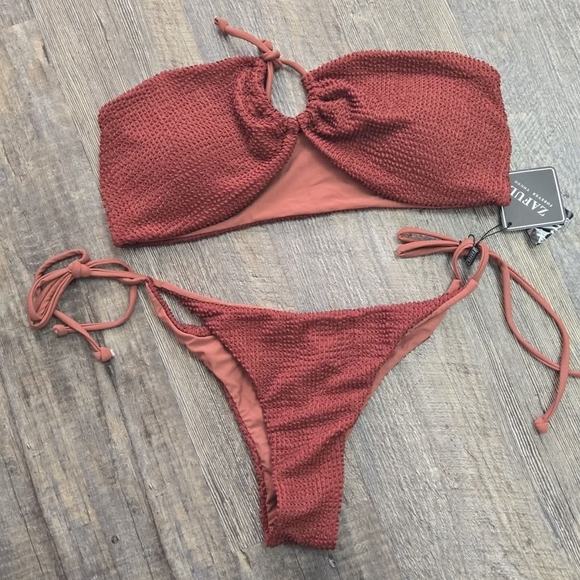 Chic rust bikini with textured fabric. Bandeau top and adjustable tie-side bottoms.