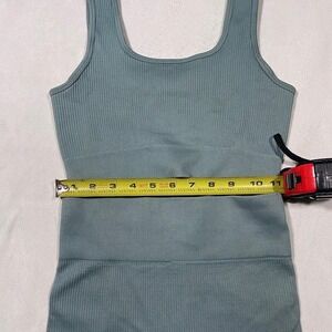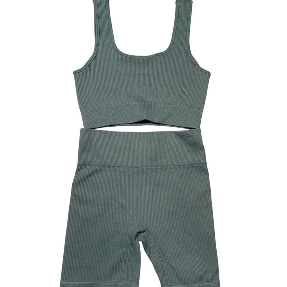 Sleek and sporty, this seamless sage green set is a gym-to-street fave Ribbed crop tank and high-waisted biker shorts give you a sculpted fit.