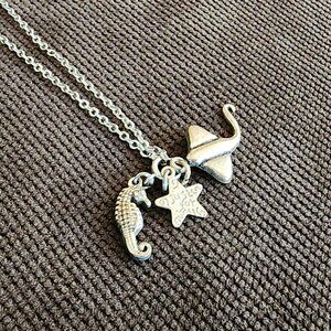 Amazon Silver Toned Sea Creature Charm Necklace. Starfish, stingray and seahorse charms. "Just for you" enscribed on the back of the starfish. Excellent pre-owned condition.