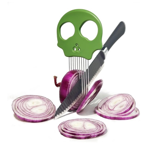 Skull multi-functional vegetable cutter from Amazon. The onion holder features a unique design that helps you slice avocados and other ingredients evenly. It also functions as a cilantro chopper, making it easy to strip cilantro leaves. Additionally, it serves as a meat tenderizer needle and a cutting stabilizer