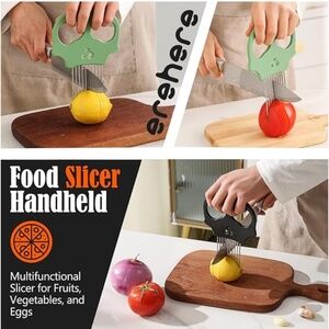 The lemon slicer is made of durable ABS and stainless steel onion, offering excellent crack resistance. It is dishwasher safe for easy cleaning. The double-hole grip design ensures ergonomic comfort while adding a touch of creativity. The tomato slicer for home use features a layout of 10 steel needles, while the herb stripper has holes with diameters of 3mm, 7mm, and 7.5mm, making it perfect for stripping most herbs. With a compact size of 7.5×5.1 inches, this product is convenient and portable, making it one of the coolest gadgets and tools for your kitchen. Not only is it a holder and slicer, but it also serves as a meat tenderizer for beef and chicken. Additionally, it functions as a fish scaler and a hand guard, helping to stabilize ingredients on the cutting board and prevents slipping. Green color! Brand new in box!