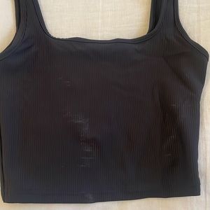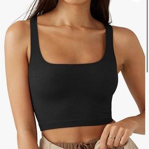 86% Polyester, 14% Spandex. It's soft, breathable, high elasticity and moisture wicking.Good to wear without bra,doesn’t see through.
