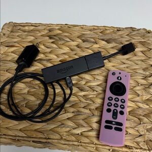 Compact Amazon streaming device. Includes a vibrant pink remote. Easy to use and portable.