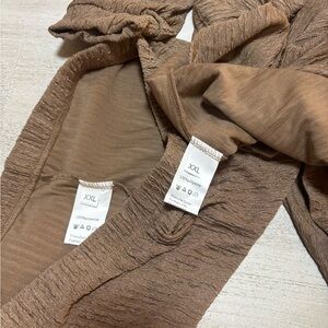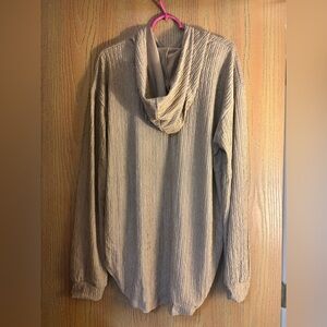 Comfortable tan ribbed jumpsuit with hoodie. Ideal for casual wear.