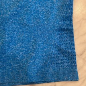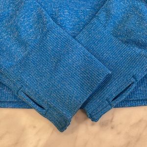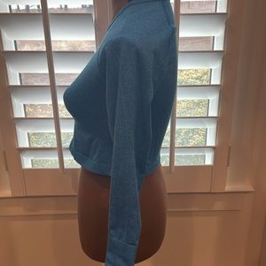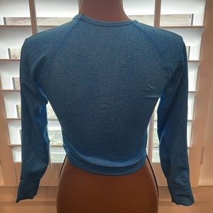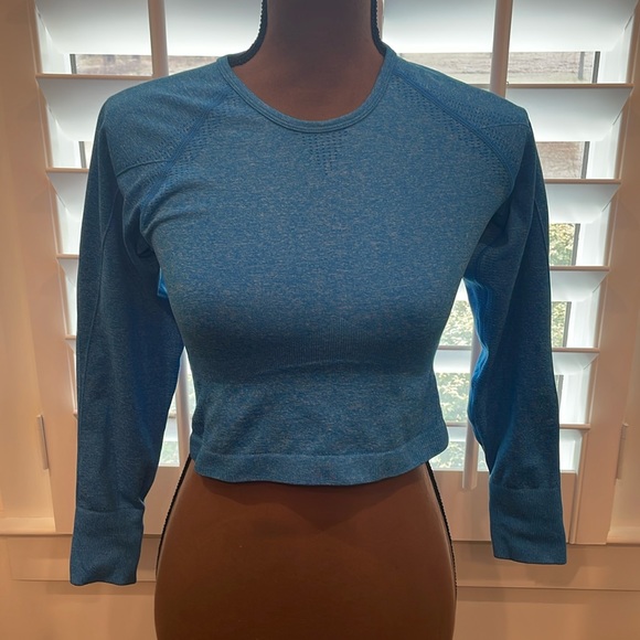 Amazon Top Size medium Nylon/polyester/elastane Measures flat pit to pit 14 inches Length 15 inches Thumbholes in sleeves.