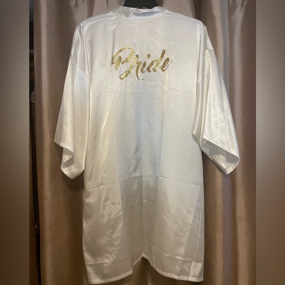 Elegant white robe with 'Bride' in gold. Perfect for special occasions.