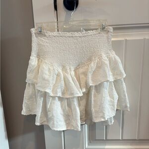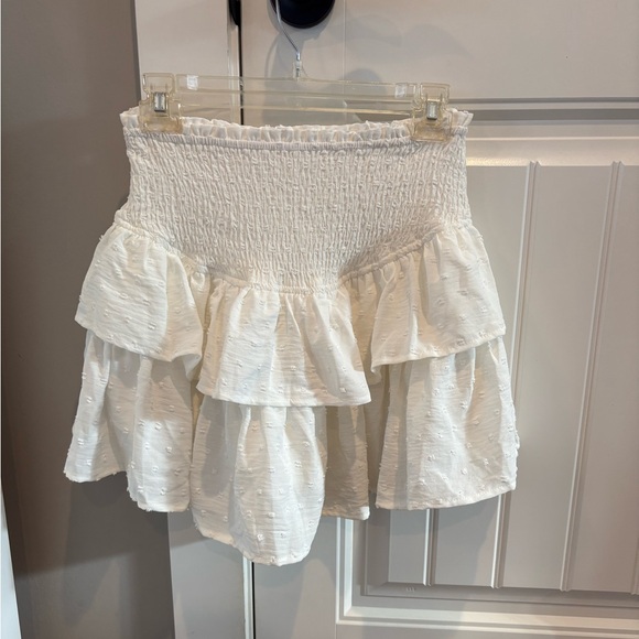Chic white skirt with ruffled layers. Elastic waistband for comfort. Perfect for casual outings.