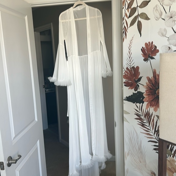 Elegant sheer robe. Flowy design with ruffled sleeves. Perfect for lounging.