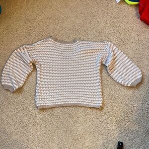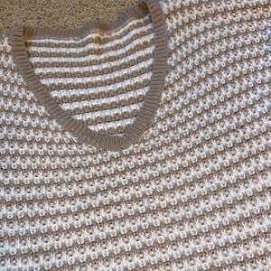 Experience the perfect blend of style and comfort with this Amazon V-neck sweater, featuring a chic white and tan striped pattern. The relaxed fit and slightly voluminous long sleeves make it an ideal choice for cozy days. Crafted from a knit fabric, it ensures warmth and timeless elegance.