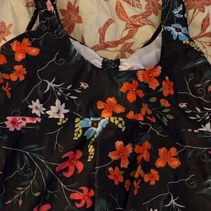 Vibrant floral design on a black camisole. Perfect for swimwear or casual wear.