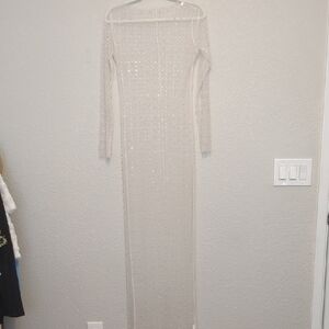 Amazon cream mesh sheet pearl studded long sleeve maxi length swim cover up