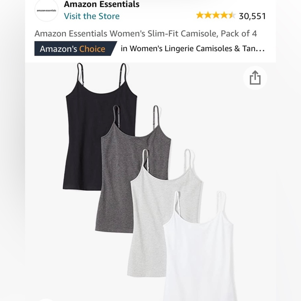 4 Slim-fit camisoles from Amazon Essentials. Opened but never worn—too small for me! My loss is your gain. No built in bra. Smoke/pet free.